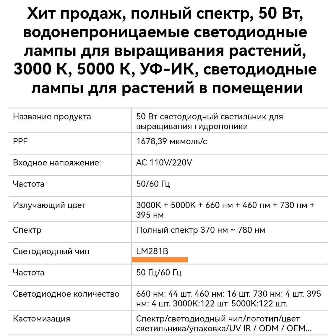 Испускающий цвет Теплый белый + красный + IR + UV + синий + полный спектр